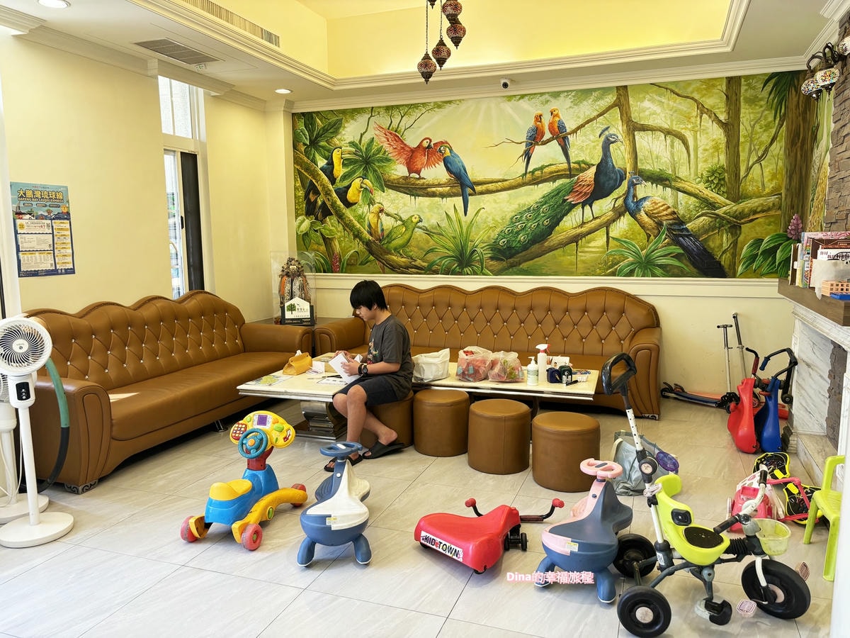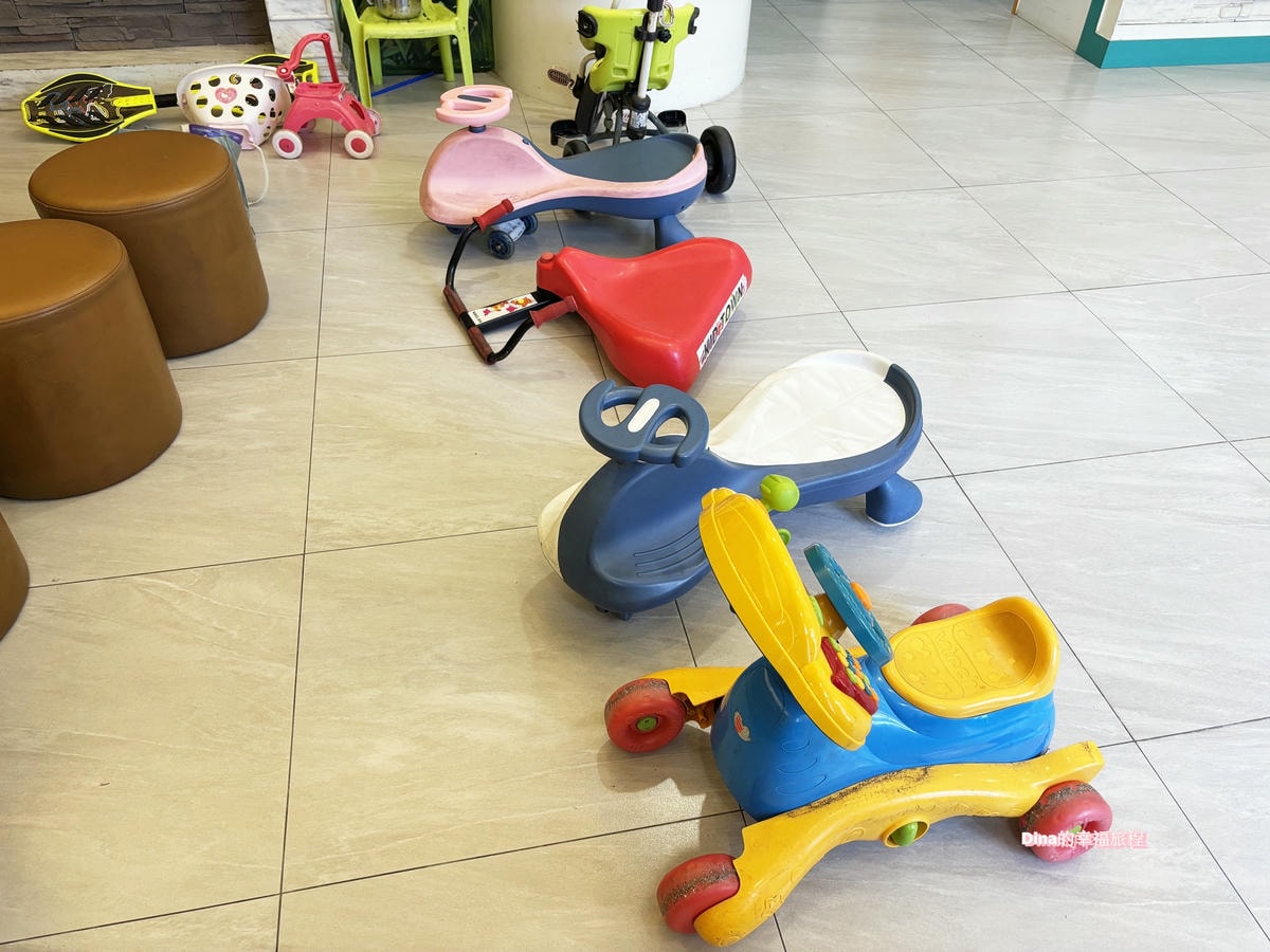 在一樓的客廳有沙發可以休息吃東西,另外還有一些小車車、滑板、扯鈴可以給孩子玩樂。