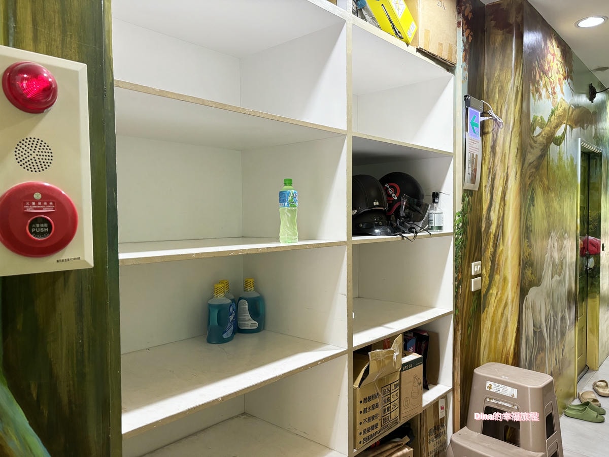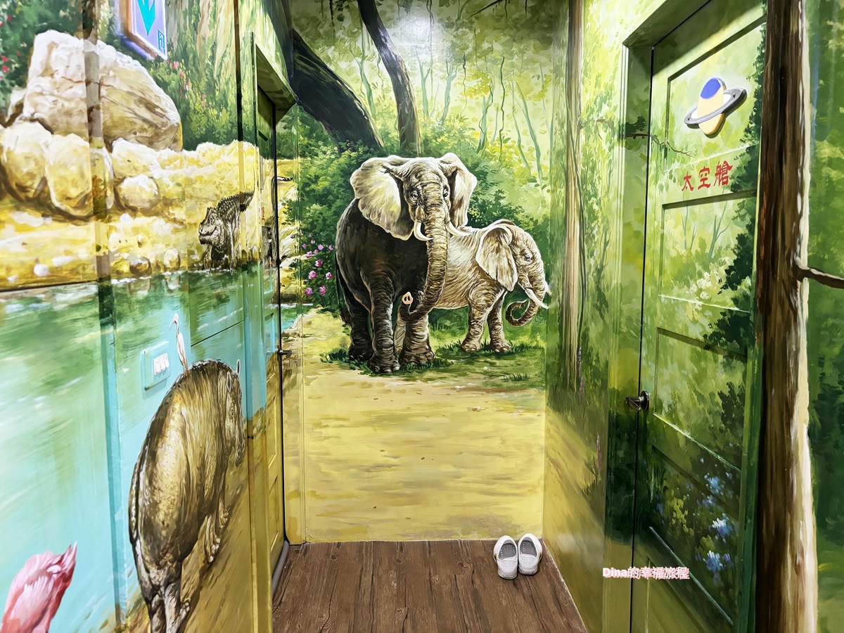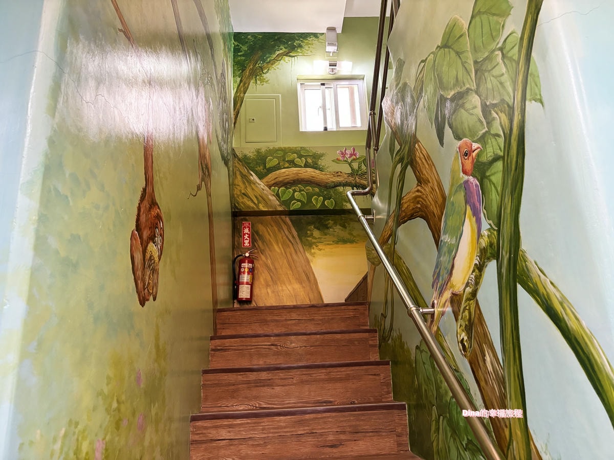 參觀完公共環境,就準備要到3樓進入我們的「太空艙」房間啦!沒想到老闆娘連民宿的走廊都設計的很用心,整棟樓都彩繪成叢林。