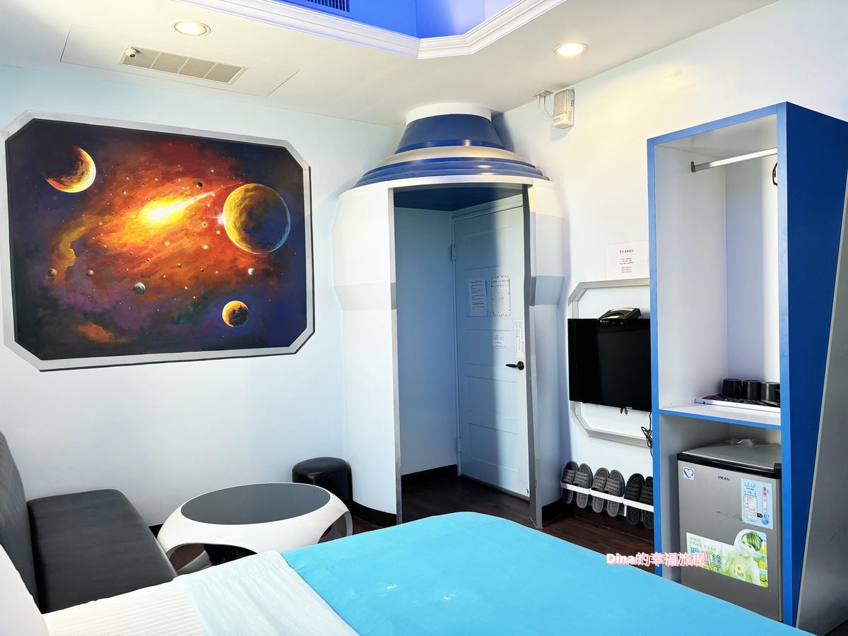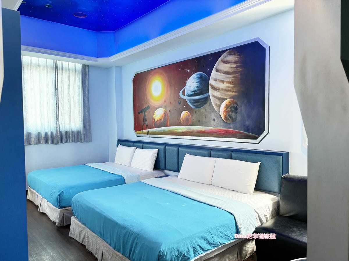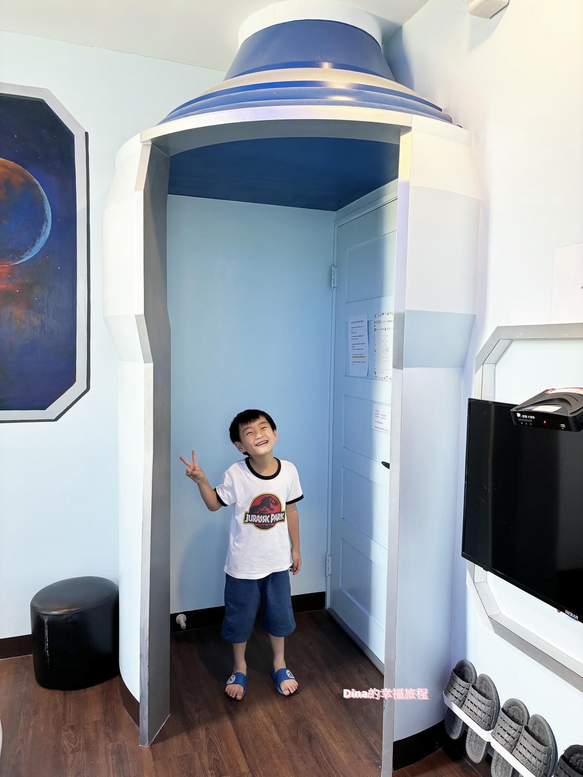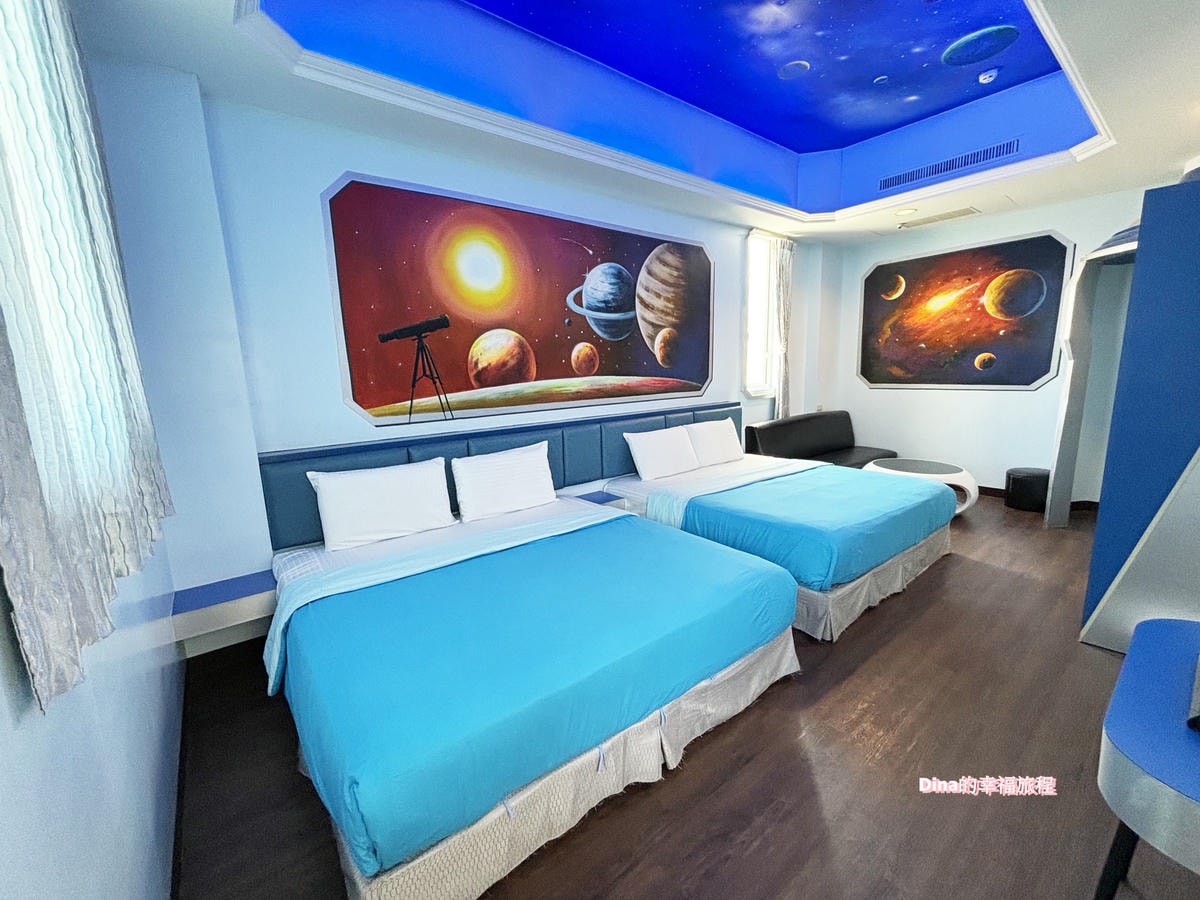 太空艙四人房,在牆面都有外太空的彩繪,製造讓小朋友有在太空艙裡往窗外看太空風景的感覺。