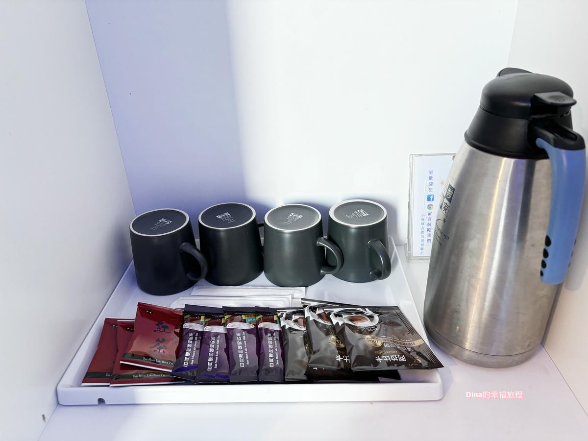 房間內有提供熱水壺和茶包、奶茶包、咖啡包,但民宿本身就有飲水機,所以我們都用飲水機來泡。